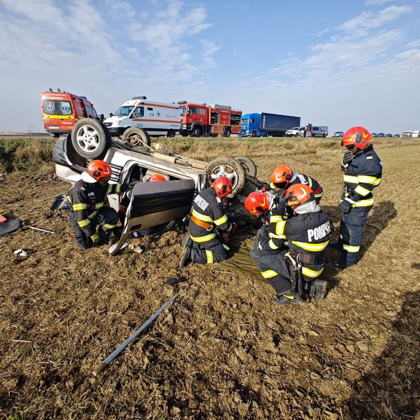 Până la sosirea pompierilor, participanții la trafic au scos cele două persoane care se aflau în autoturismul răsturnat.