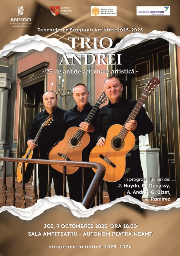 Astfel, joi, 9 octombrie 2025 (ora 18:00), la sala amfiteatru de la Autonom, va avea loc Recitalul de chitară clasică susținut de „Trio ANDREI”, prilejuit de aniversarea a 25 de ani de activitate a acestui prestigios grup muzical clujean. După un scurt turneu prin Capitală, cu o oprire la Muzeul Municipiului București – Palatul Suțu, maeștrii chitarei, Constantin Andrei, Aurelian Andrei şi Adrian Andrei, vin și la Piatra-Neamț, deschizând, cu acest prilej, Stagiunea muzicală 2025-2026 organizată de instituțiile amintite.