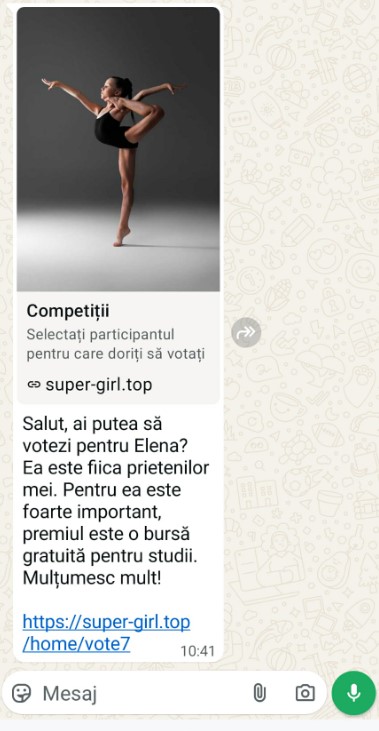 „Bună! Te rog să o votezi pe Adeline în acest sondaj. Este fiica prietenei mele, iar premiul este o bursă pentru studii în Franța. Mulțumesc mult!”